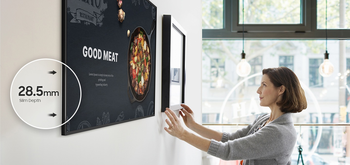QBC는 두께가 단 28.5mm에 불과한 초슬림 디스플레이로, 삼성 UHD 사이니지 라인업 중 가장 얇은 모델입니다. 벽과의 간격을 최소화해 마치 공간에 자연스럽게 녹아드는 듯한 깔끔한 설치가 가능하며, 세련된 인테리어 효과까지 더합니다.