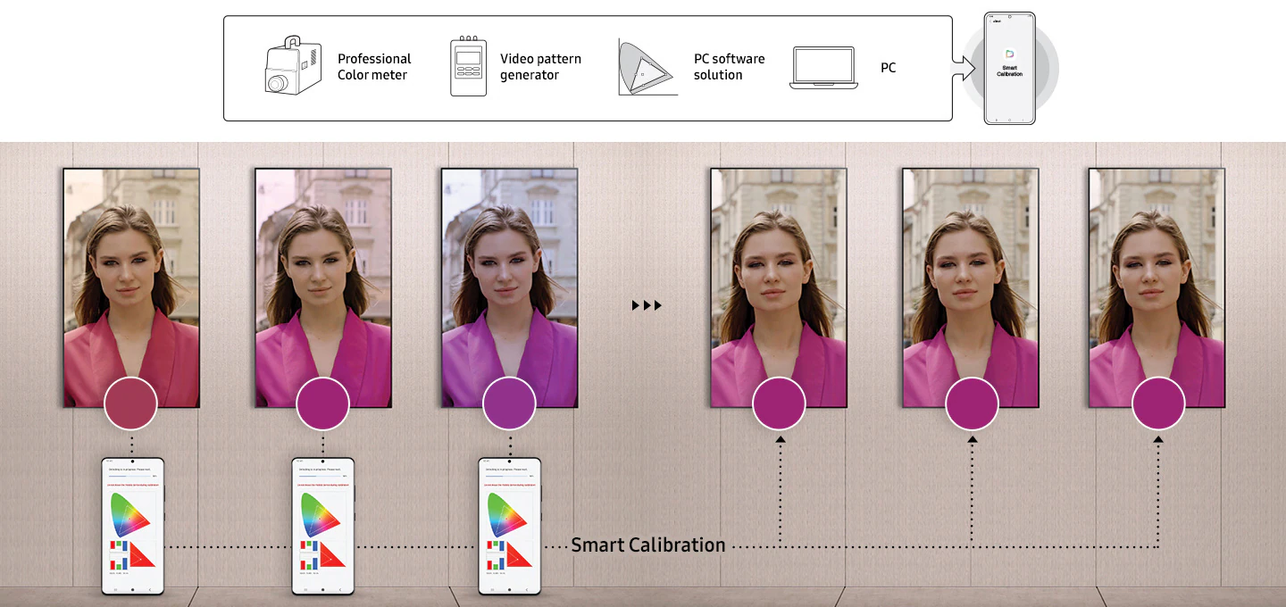 스마트폰 앱을 통해 언제 어디서나 컬러를 자동 보정할 수 있는 스마트 캘리브레이션 기능도 지원합니다. 브랜드 로고나 특정 색상의 정확한 표현이 중요한 환경에서도 일관된 화면 품질을 유지할 수 있어, 전문적인 비즈니스 운영에 적합합니다.