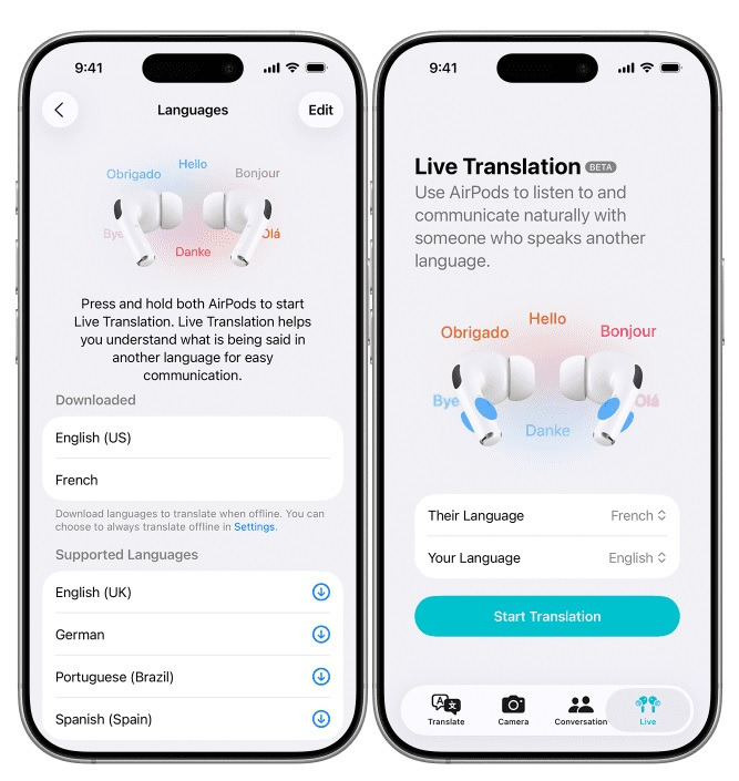 이 기능은 아이폰뿐만 아니라 에어팟에서도 지원됩니다. 에어팟 프로 2세대, 3세대, 액티브 노이즈 캔슬링이 적용된 4세대 모델에서 사용할 수 있습니다. 에어팟을 착용한 상태에서 외국어 대화를 하면, 상대방의 말을 자동으로 번역된 음성으로 듣게 되므로, 언어 장벽이 크게 낮아질 것으로 기대됩니다.