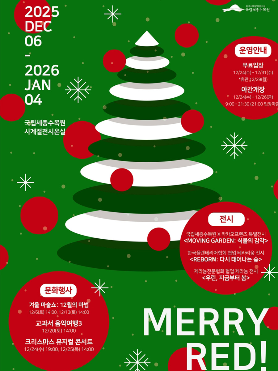 도심과 맞닿아 있으면서도 사계절의 자연을 담은 국립세종수목원은 연말의 짧은 휴식에 최적의 장소입니다. 무료입장 기간 동안 낮과 밤, 각각의 풍경을 비교하며 자연이 주는 위로를 느껴보는 시간을 가져보시기 바랍니다.