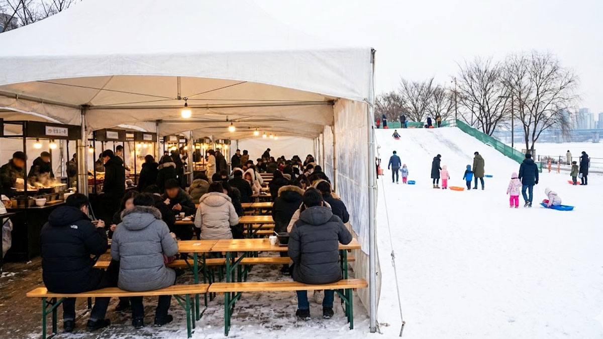 이번 시즌에는 눈썰매장 옆에 가로 40m, 세로 20m 규모의 대형 천막 푸드존이 새로 조성되었습니다. 수백 명이 동시에 이용할 수 있으며, 눈썰매를 즐긴 뒤 따뜻한 식사와 휴식을 한 자리에서 해결할 수 있습니다.